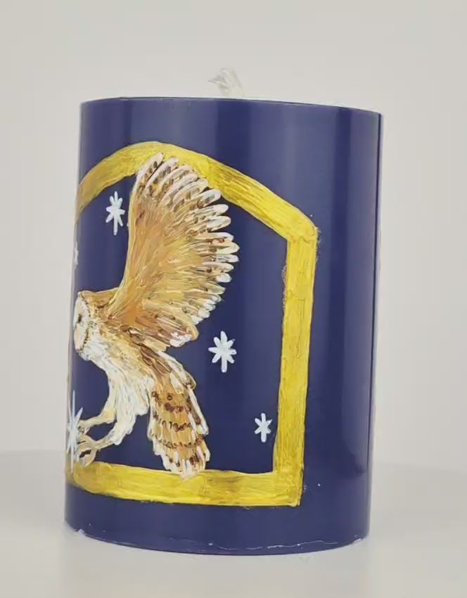 A deep midnight blue candle, hand-painted with two elegant barn owls beneath golden arches, surrounded by stars and a crescent moon. Each piece is carefully created in Our Little Burrow using burn-safe paints.